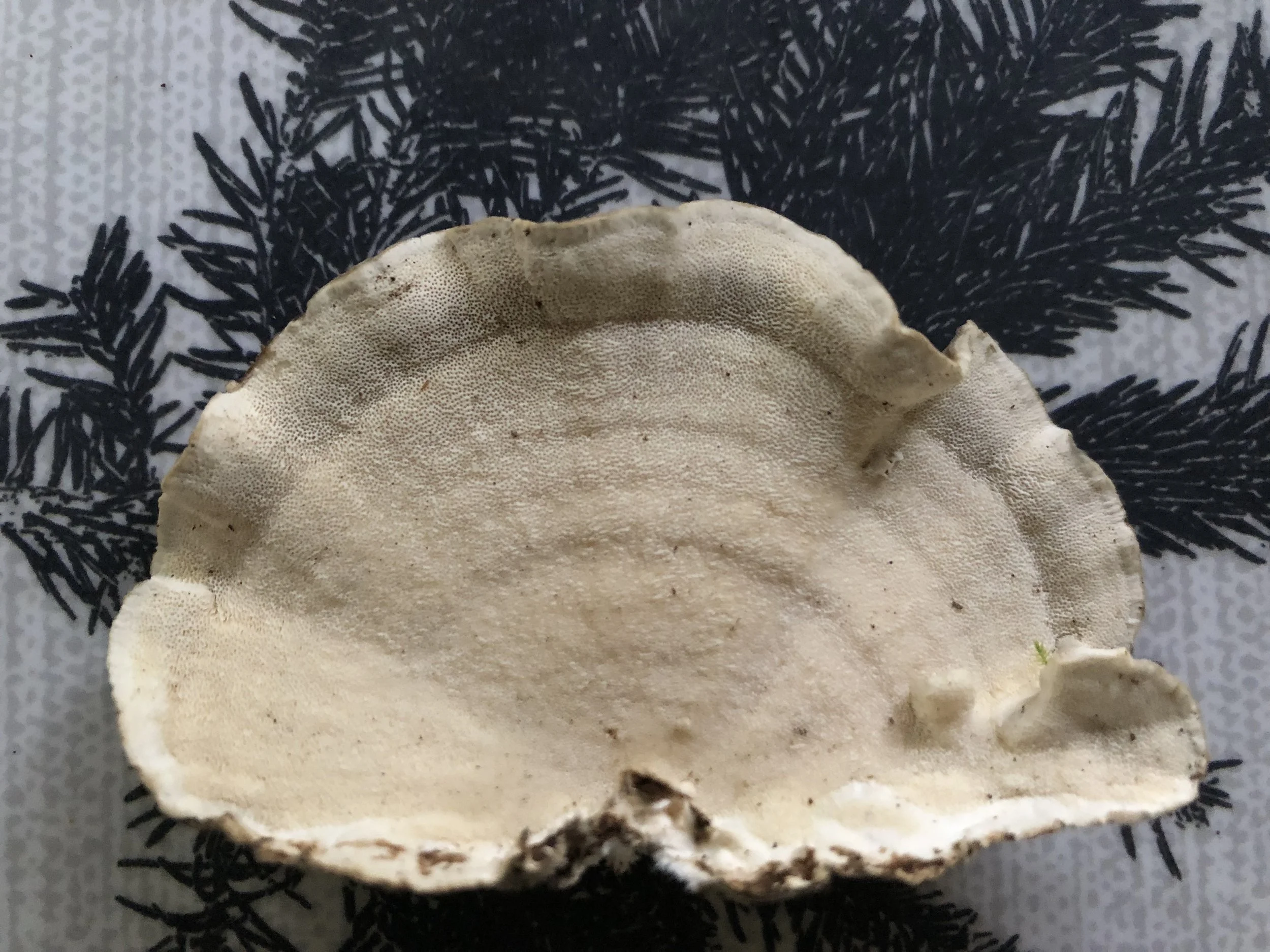 Turkey Tail is called that because it looks like one. It’s fan shaped and velvety and has different coloured bands (reddish, greyish, brownish) running across it . The underside has tiny visible spores.