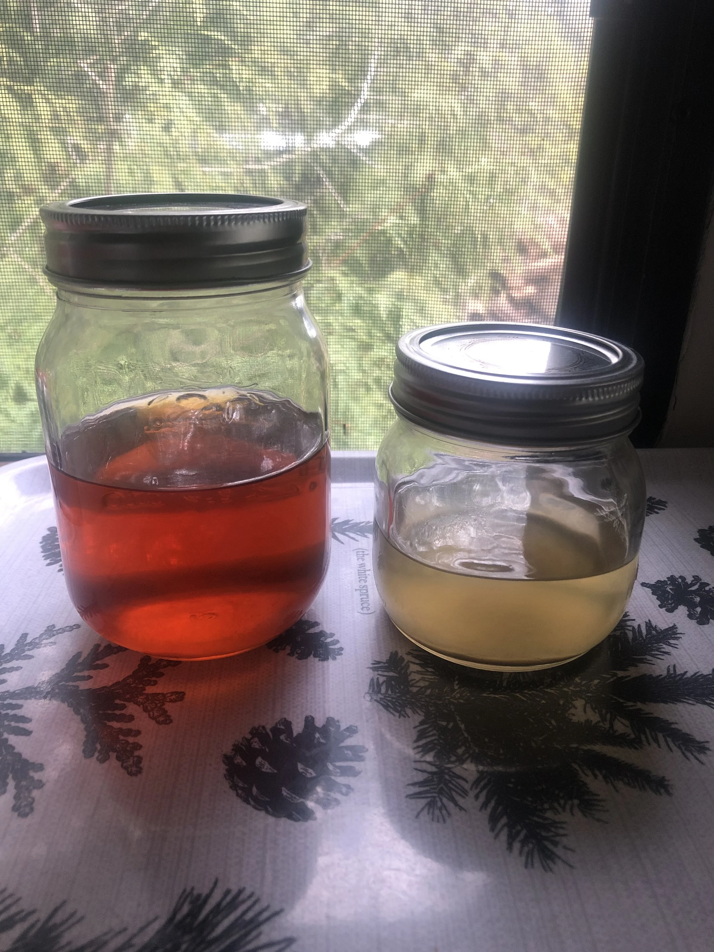 The lighter one on the right is the turkey tail extraction; the reddish one on the left is a red-belted polypore extraction we were making at the same time